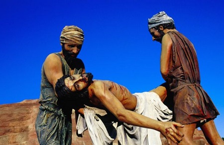 Life-size statues are seen in the recreation of the hill of Golgotha where Jesus was crucified at Tierra Santa (Holy Land)